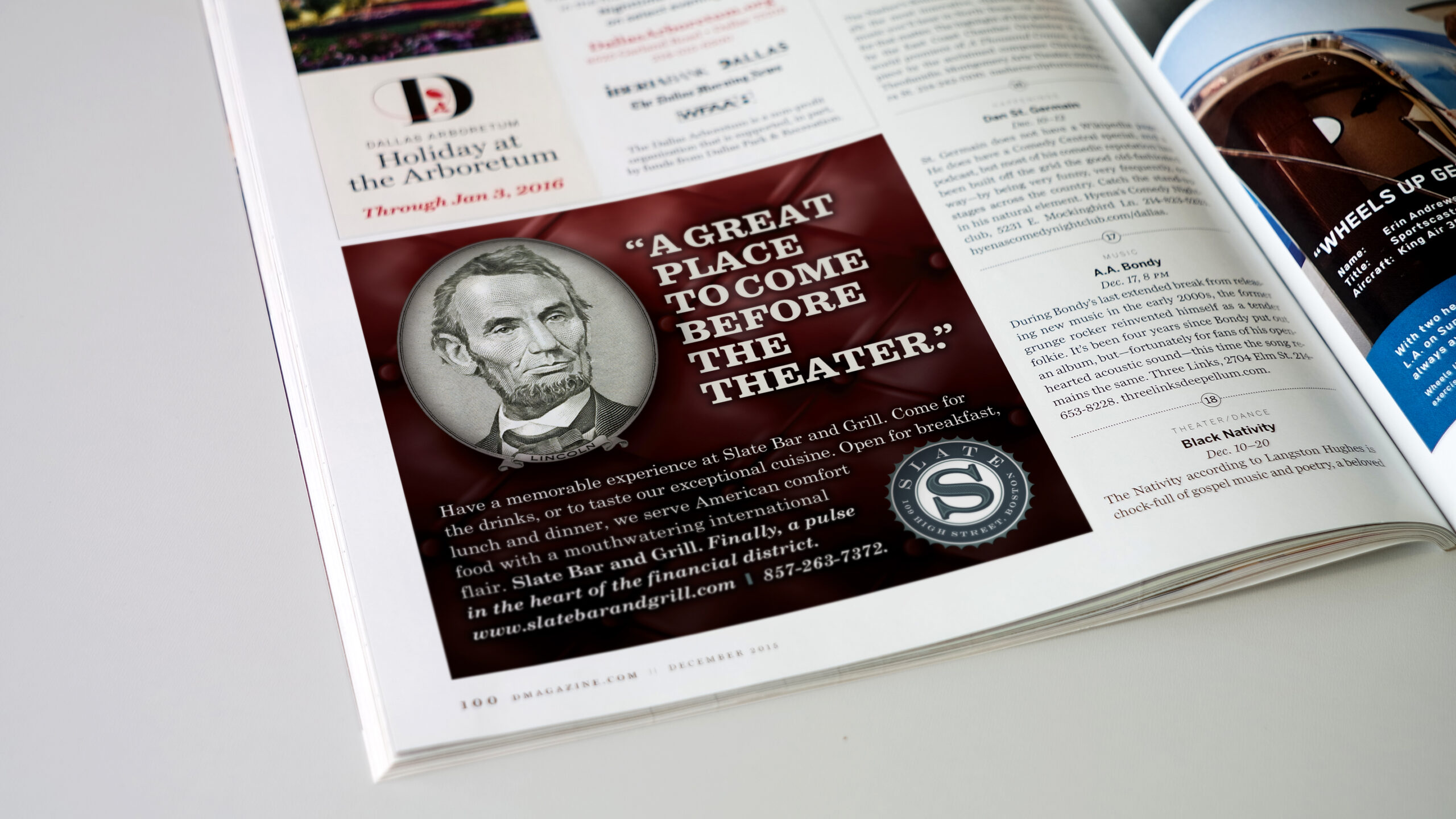 For Slate Bar and Grill, we created a fun, hip brand, including a logo, identity, and campaign, that would appeal to Boston’s young movers and shakers in the financial industry and beyond.
